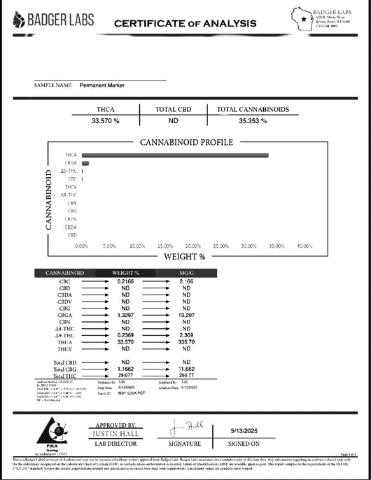 Permanent Marker is a standout indica-leaning hybrid born from the legendary genetics of Biscotti, Sherbert, and Jealousy. This lineage brings together the best of Gelato, Sunset Sherbert, and GSC heritage, creating a cultivar that has quickly become a favorite among hemp and cannabis enthusiasts.